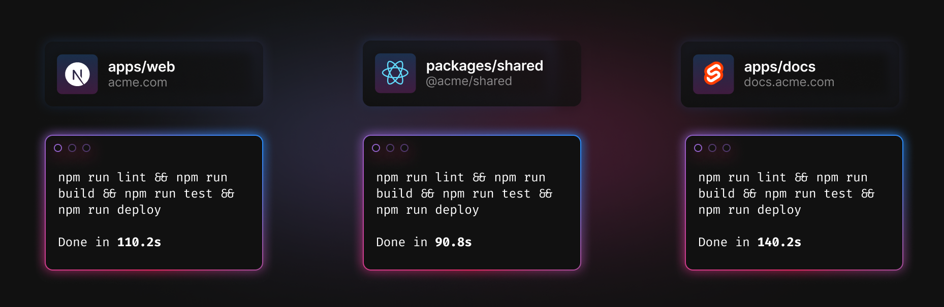 Monorepos have many advantages - but they struggle to scale. Each workspace has its own test suite, its own linting and its own build process. A single monorepo might have hundreds of tasks to execute.