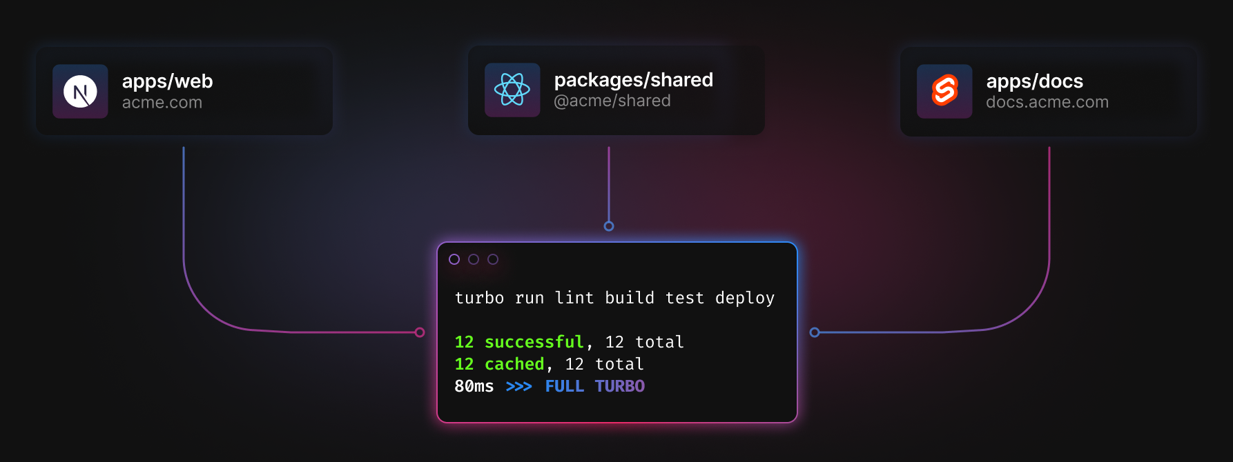 Turborepo can be adopted incrementally. It uses the package.json scripts you've already written, the dependencies you've already declared, and a single turbo.json file. You can use it with any package manager, like npm, yarn or pnpm. You can add it to any monorepo in just a few minutes.
